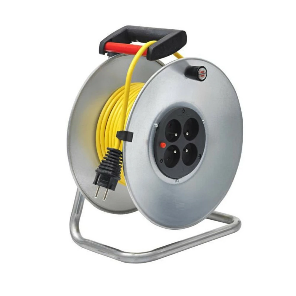 25m de câble jaune h05vv-f 3g1,5 – 1 fiche 2p+t 16a/230v~ – 4 prises 2p+t 16a/230v~ a clapets – disjoncteur thermique – puissance maxi : 3500w câble déroulé – 1000w câble non déroulé – protection enfants