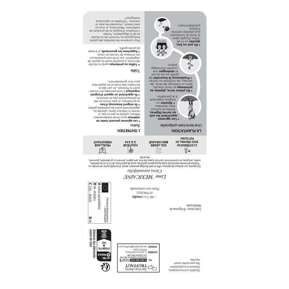Originaire de l’Asie du Sud-Est, le limettier (Citrus aurantifolia) est l’arbre qui produit les limes, les fameux citons verts. ‘ Mexicaine’ est une variété horticole.Ce citronnier atteint une hauteur de 3 m pour une largeur de 2,50 m. Rameaux très épineux. Feuillage persistant, dense, vert tendre. Feuilles petites, ovales. Floraison blanche, avec des tâches pourpres au départ, parfumée, au printemps. Fruits petits, de 3 à 5 cm de diamètre, ovales, vert-jaune, en automne-hiver. Fruit à peau très fine, sans pépins, donnant un jus abondant, jaune-vert, très acide. Rustique jusqu’à -3°C.On les plante sur la Côte d’Azur en pleine terre, dans un sol léger, perméable, bien drainé et non calcaire. Exposition au soleil, à l’abri des vents. Partout ailleurs, culture en pot en rentrant la plante dans une véranda tenue hors gel, à une température de 10°C environ. Ne pas sortir la plante directement au soleil au printemps.