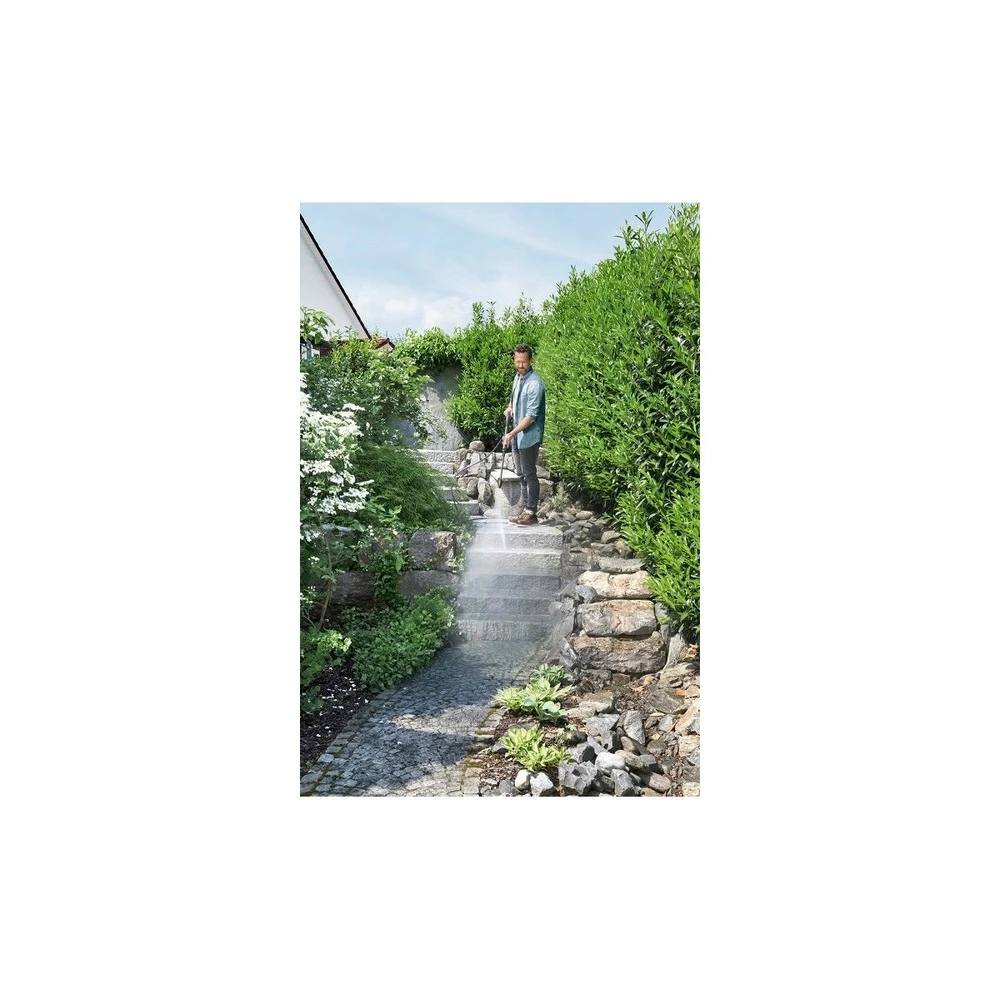 dans le coffre d’une voiture ou simplement sur une étagère : grâce à sa taille compacte, le nettoyeur haute pression k4 compact s’adapte sans difficulté à tous les espaces. L’appareil en fonctionnement est incroyablement pratique : k 4 compact peut être utilisé à la fois horizontalement et verticalement, il est facile à transporter et rapide à ranger et offre toute la puissance d’un nettoyeur haute pression normal. De plus, la poignée télescopique réglable en hauteur facilite le déplacement. Autres détails : deux poignées de transport, pistolet avec système quick connect, tuyau haute pression de 6 m, lance vario power (vps) et filtre à eau. Le tuyau et le câble haute pression peuvent être facilement rangés au-dessus du capot avant le k 4 compact, avec son moteur refroidi à l’eau et un débit de 30 m² / h, est idéal pour le nettoyage occasionnel de saletés modérées (petites petites voitures, clôtures, vélos, etc).